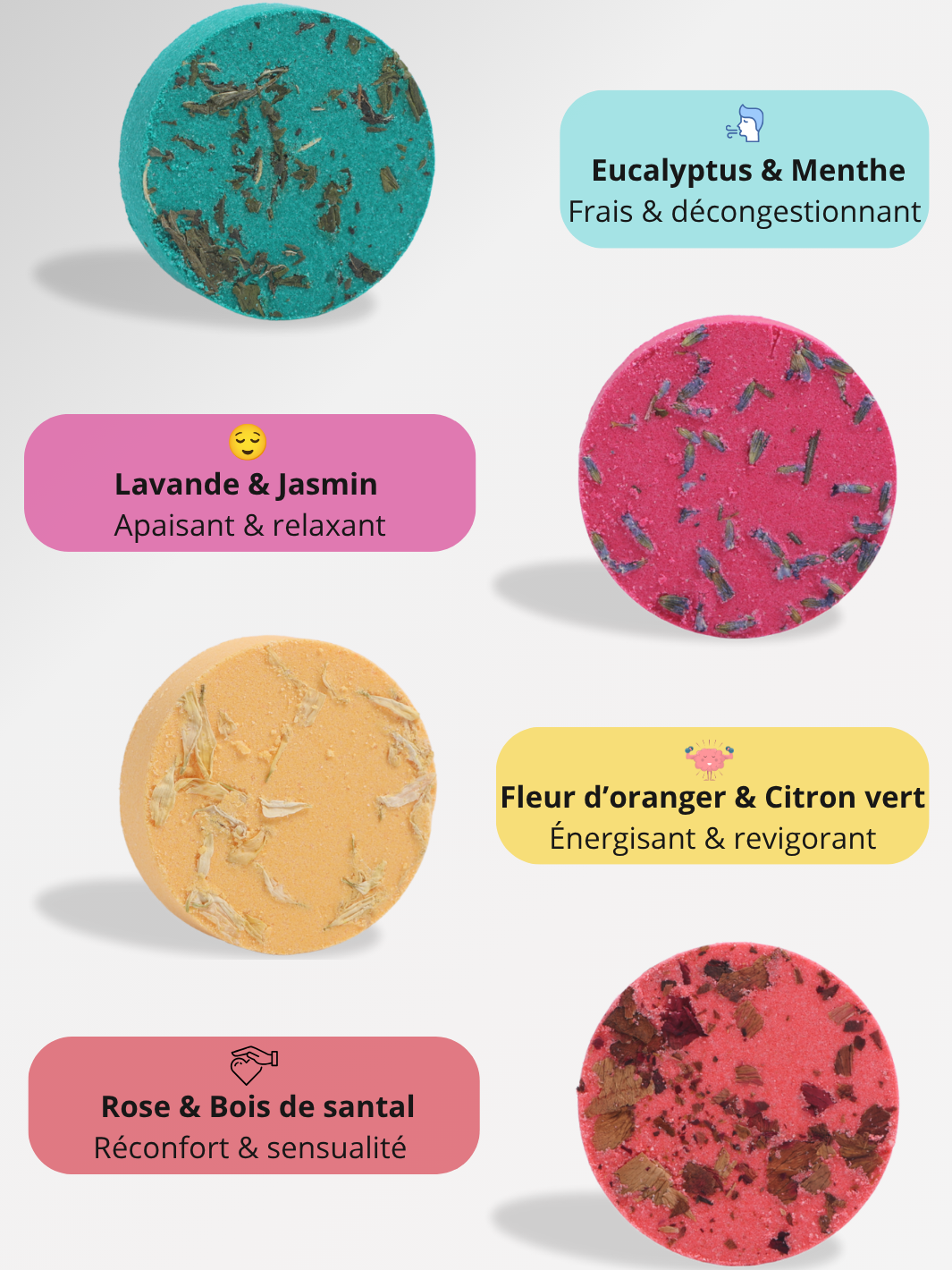Chaque bombe de douche libère des huiles essentielles pour transformer votre salle de bain en spa. Votre routine devient un véritable soin d’aromathérapie : apaisant, naturel et profondément ressourçant.